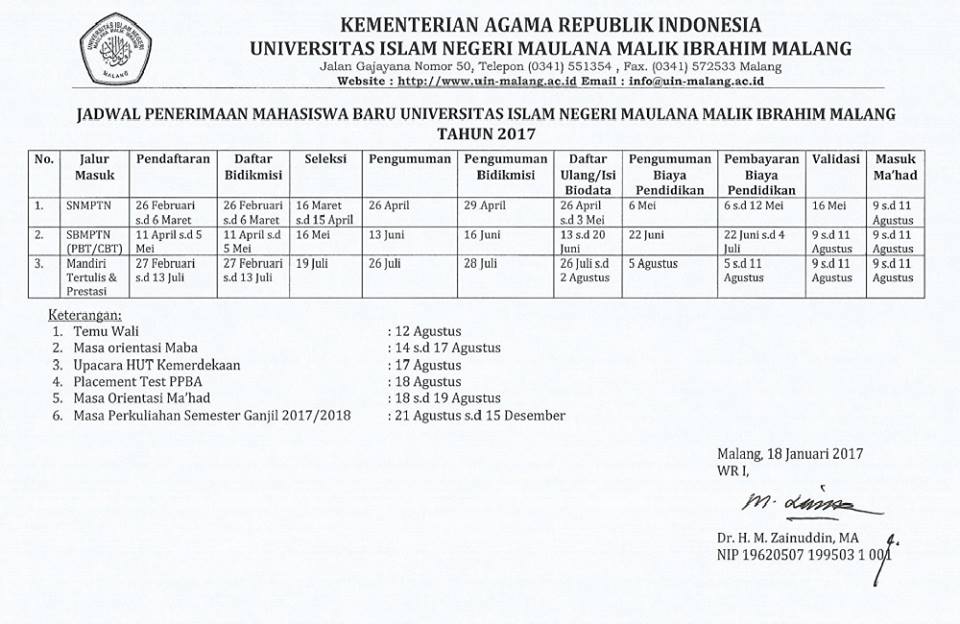 Pengumuman Jadwal Penerimaan Mahasiswa Baru UIN Maliki Malang Tahun 2017